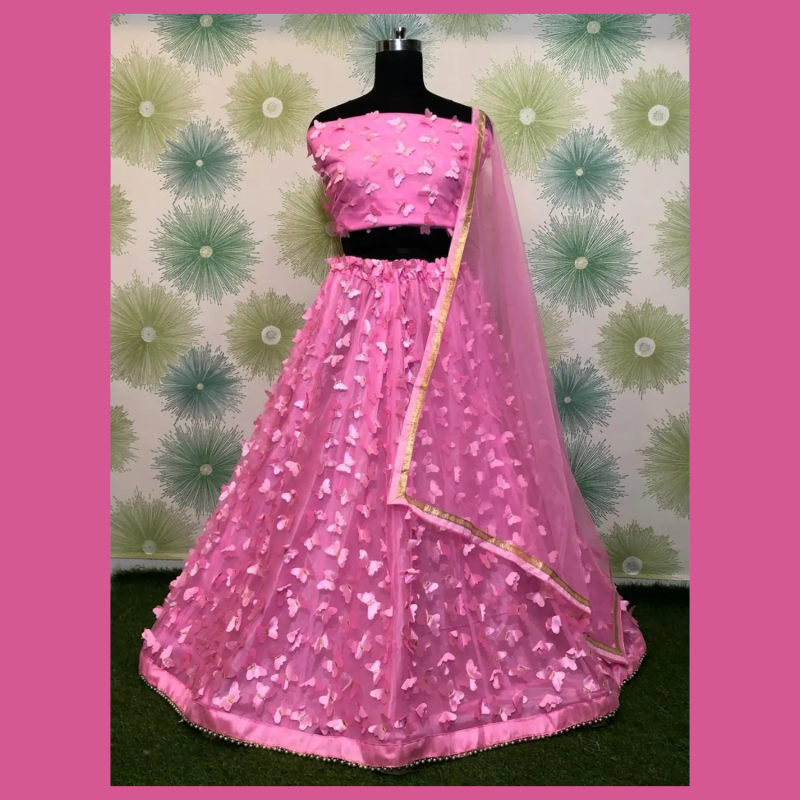 مصمم NET 3D عمل فراشة LEHENGA CHOLI مع DUPATTA PINK