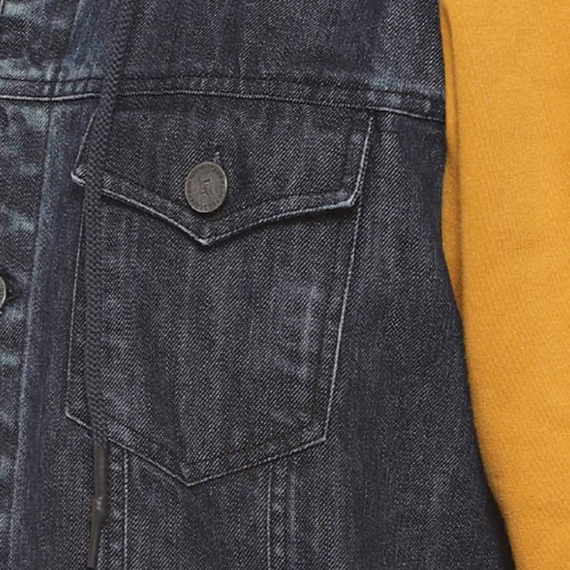 Charcoal washed colourblocked windcheater denim jacket, has a hooded, 4 pockets ,has a button closure, long sleeves, straight hemline, cotton lining
