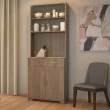 A ton of storage. The Hubert kitchen cabinet is the storage superstar your kitchen has been looking for. A mix of open and closed storage makes room for cutlery, vessels, and all else. The glass-fronted shelves provide the perfect niche for your prize china, while the melamine table top doubles up as counter space for appliances. Just what you need, whether you’re a budding cook or a practised chef!
